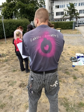 Dann durften wir selbst kreativ werden. Jede und jeder von uns hat ein eigenes Motiv entworfen. Die Bilder sollten eine politische oder gesellschaftliche Aussage haben. Zum Beispiel ging es um Themen wie Frieden, Krieg, Gerechtigkeit oder Freiheit. Wir haben zuerst Schablonen (Stencil) gebastelt und danach mit Sprühfarbe gearbeitet. So haben wir gelernt, wie viel Arbeit in einem Bild steckt und wie man mit Kunst etwas sagen kann.